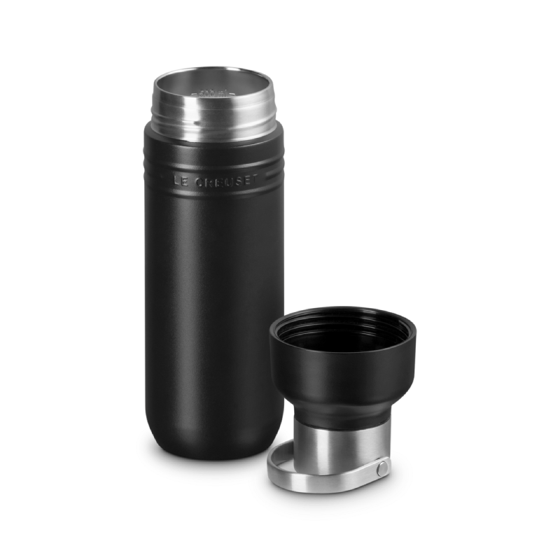 Izolowana butelka na wodę Le Creuset utrzymuje napoje gorące lub zimne przez wiele godzin dzięki podwójnej izolacji próżniowej. Wykonana jest z trwałej stali nierdzewnej (SS304) dopuszczonej do kontaktu z żywnością. Sprawdza się idealnie jako butelka podróżna lub do samochodu.