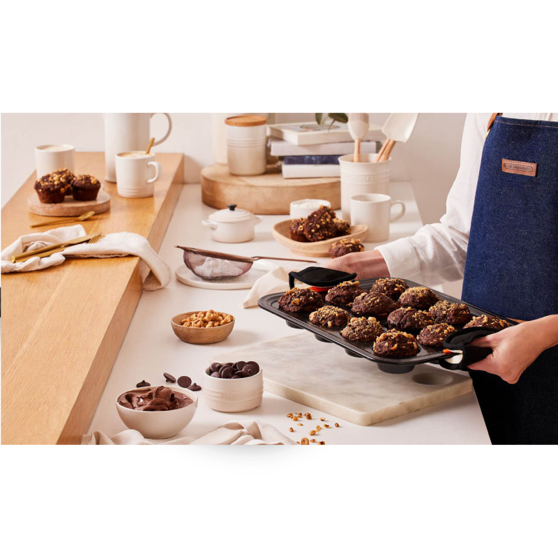 Forma na 12 muffinów Le Creuset to idealne naczynie do pieczenia zarówno słodkich babeczek, jak i małych quiche. Ta blacha wykonana jest z wytrzymałej stali węglowej pokrytej nieprzywierającą powłoką, a dodatkowe silikonowe wkładki na krawędziach zapewniają bezpieczny chwyt i ułatwiają podnoszenie.