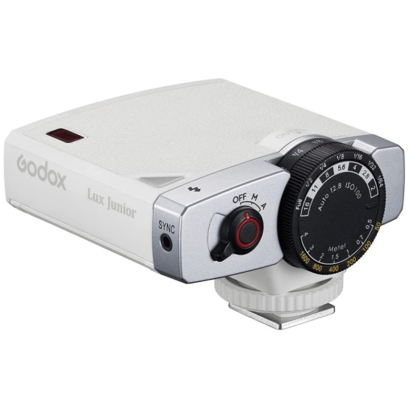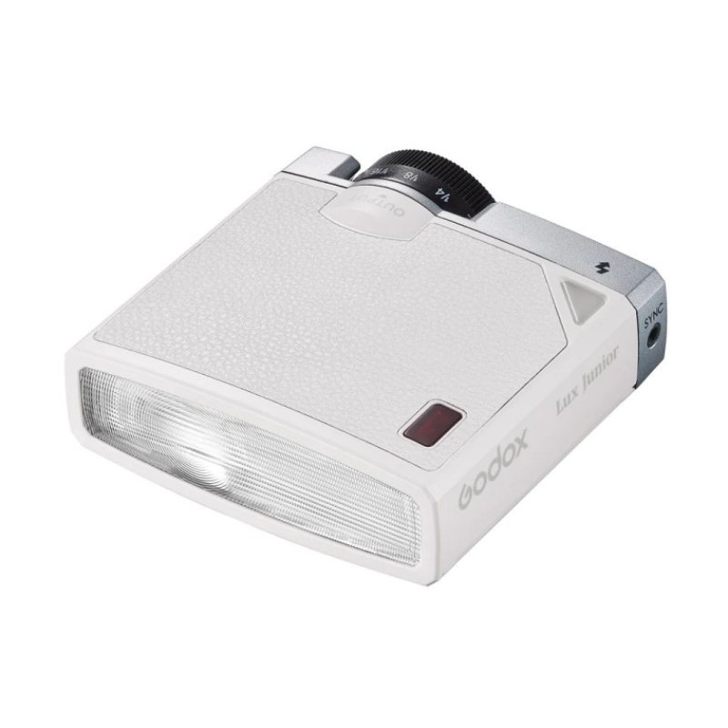 Biała retro lampa błyskowa Godox Lux Junior stanowi stylowe i kompaktowe oświetlenie do zdjęć, łączące klasyczną estetykę z nowoczesną funkcjonalnością. Ta lekka lampa reporterska o liczbie przewodniej 12 idealnie sprawdza się jako mobilna lampa do aparatu, stanowiąc poręczne oświetlenie fotograficzne do codziennego użytku. Zasilana dwiema bateriami AAA jest wygodną alternatywą dla większych lamp studyjnych w fotografii ulicznej i okazjonalnej.