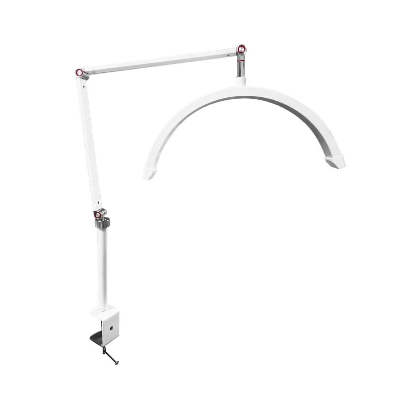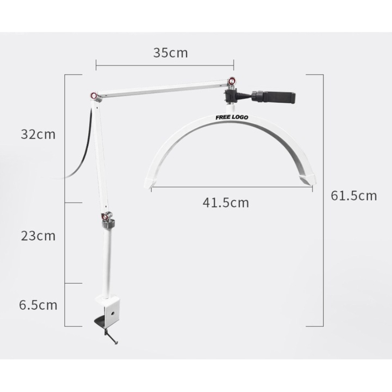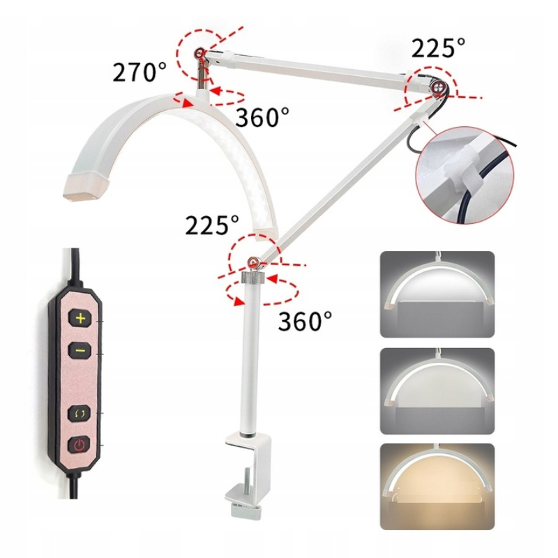 Profesjonalna lampa kosmetyczna bezcieniowa o łukowatym kształcie zapewnia idealne oświetlenie podczas zabiegów makijażu, stylizacji rzęs czy tatuażu, dzięki wysokiemu współczynnikowi CRI > 95 oraz regulowanej temperaturze barwowej. Zestaw wyposażony został w stabilny statyw oraz uniwersalny uchwyt na telefon, który bezpiecznie pomieści urządzenia o szerokości od 60 do 95 mm. Doskonale sprawdzi się jako lampa dla vlogera dzięki możliwości komfortowego nagrywania efektów pracy.