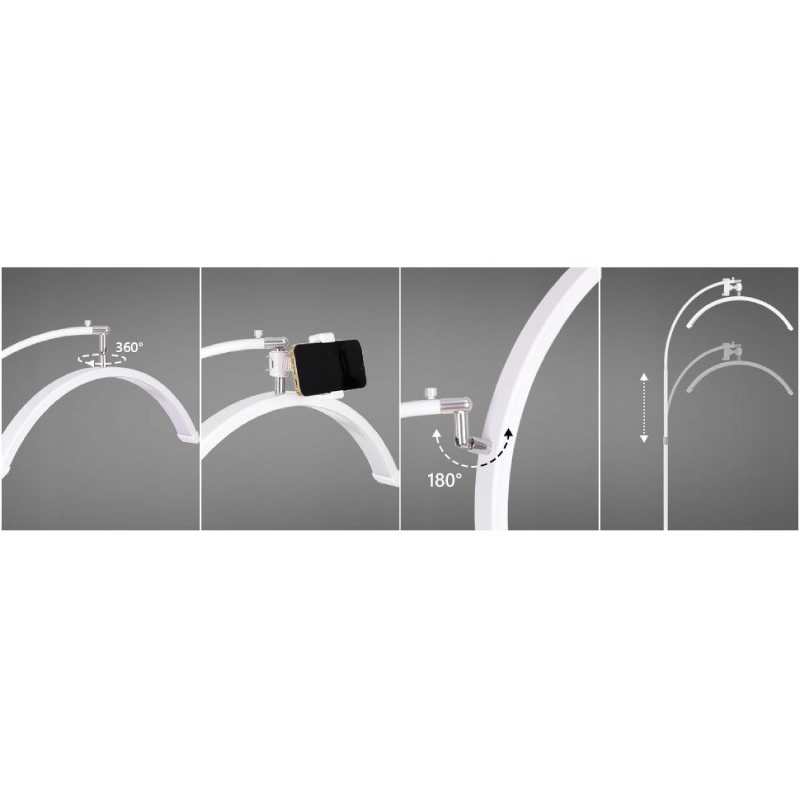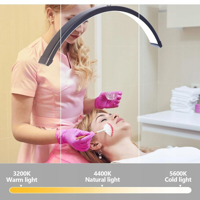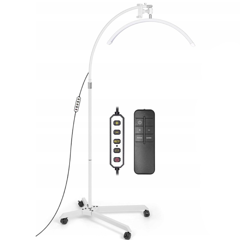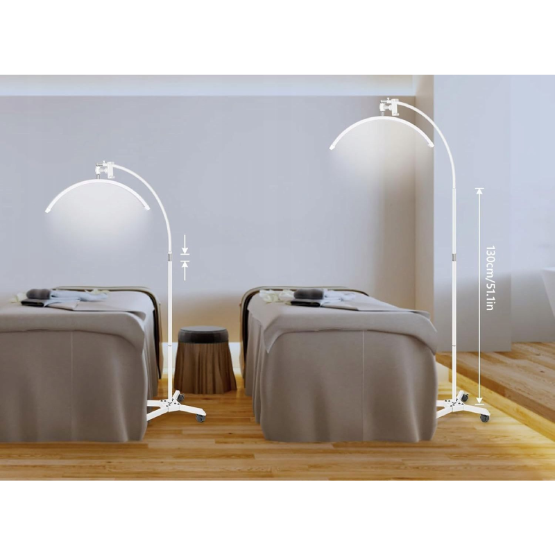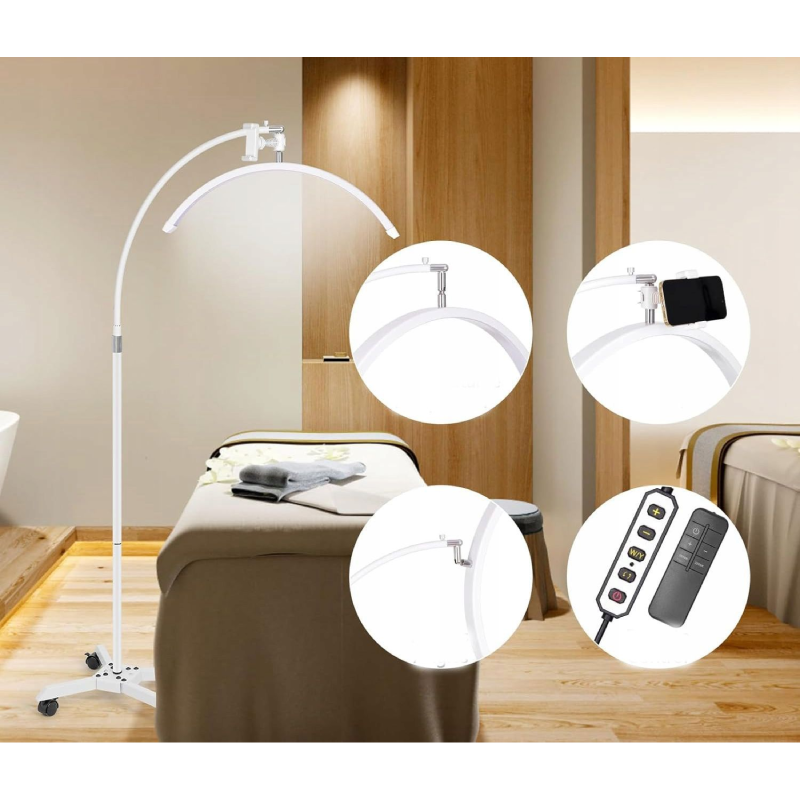 Lampa ta jest modelem mobilnym, osadzonym na podstawie z kółkami, co ułatwia jej przemieszczanie w gabinecie. Każde z kółek posiada blokadę, zapobiegającą przypadkowemu przesunięciu się lampy podczas pracy. Głowica w kształcie półksiężyca umożliwia obrót o 360°, co w połączeniu z regulowanym statywem daje możliwość precyzyjnego ustawienia światła nad polem zabiegowym. Prezentowana lampa kosmetyczna jest doskonałym wyborem zarówno dla profesjonalnych kosmetyczek, jak i dla tych dopiero rozpoczynających swoją przygodę w branży beauty.