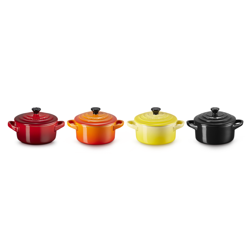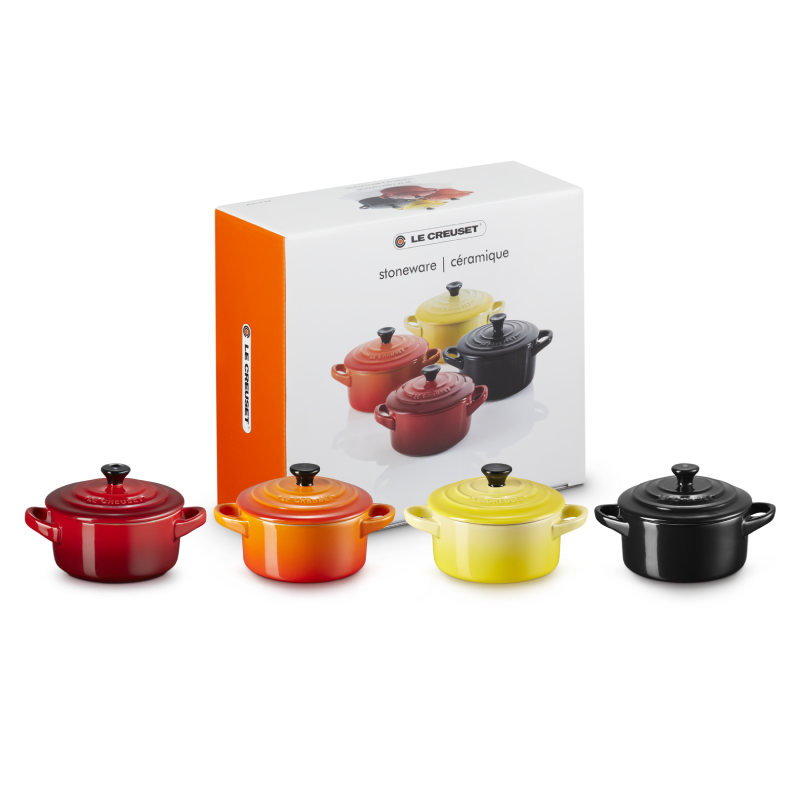 Ten zestaw czterech mini cocotte Le Creuset to urocze i praktyczne naczynia z kamionki idealne do przygotowywania i serwowania pojedynczych porcji deserów, zup lub przekąsek. Kamionka charakteryzuje się perfekcyjnym wykonaniem i odpornością na temperatury w zakresie od -23℃ do 260℃.