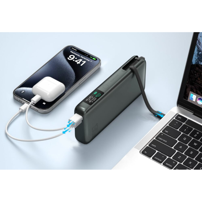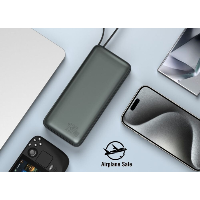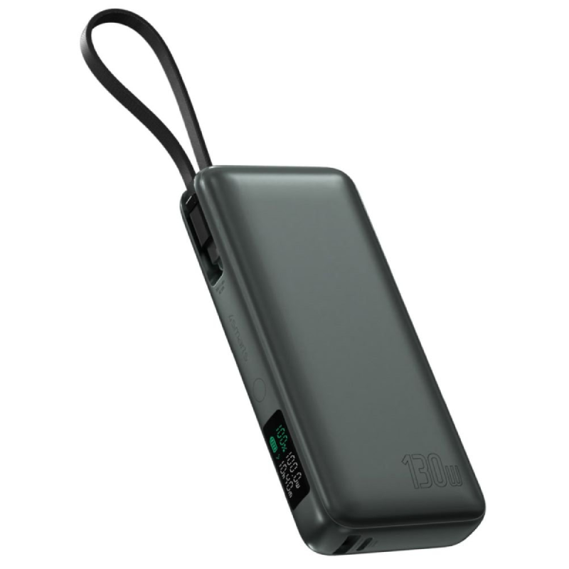 Ten powerbank ze zintegrowanym kablem jest mobilnym centrum zasilania, oferującym dużą pojemność 20000 mAh oraz imponującą moc 130 W, co czyni go w pełni funkcjonalnym powerbankiem do laptopa.