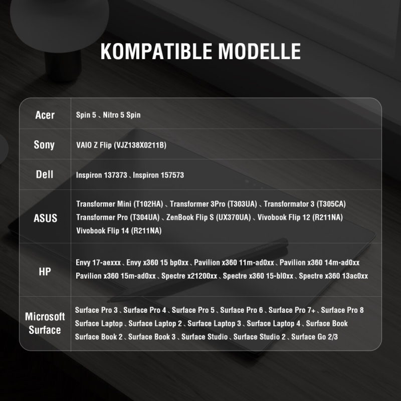 | Dołączone akcesoria | 1 x pióro MPP Surface Pen w kolorze czarnym, 1 x kabel ładujący USB-C, 3 x wymienne końcówki, 1 x instrukcja obsługi. |