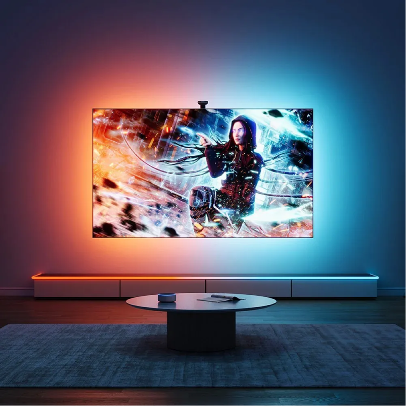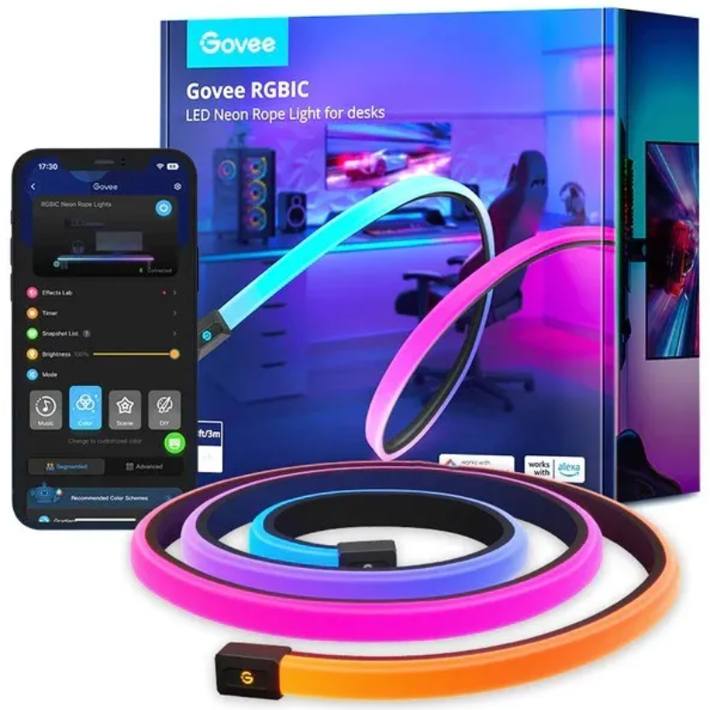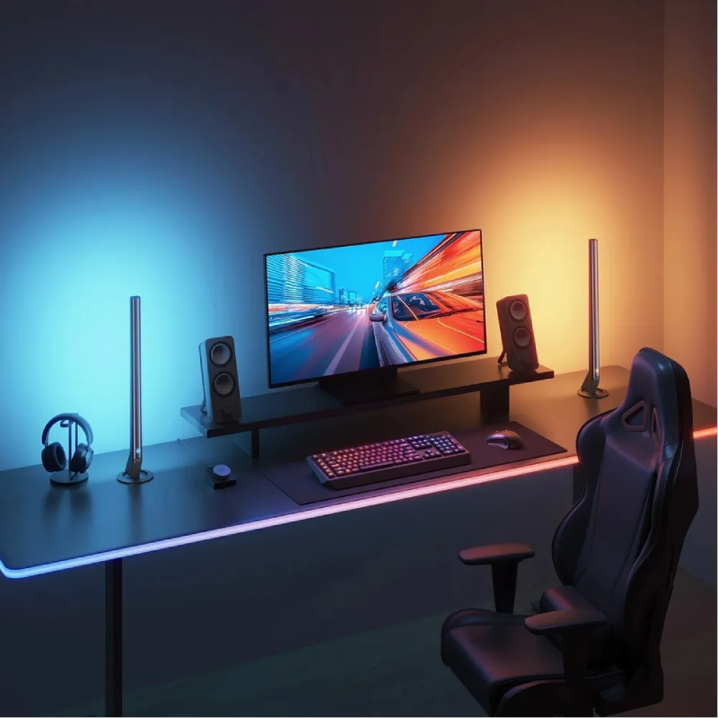 Inteligentna taśma neonowa RGBIC Govee o długości 3 metrów umożliwia stworzenie efektownego podświetlenia krawędzi biurka gamingowego z unikalnym efektem matowej powłoki. Urządzenie oferuje 11 trybów muzycznych oraz pełną synchronizację z ekosystemem Razer Chroma, co gwarantuje maksymalną immersję podczas rozgrywki.