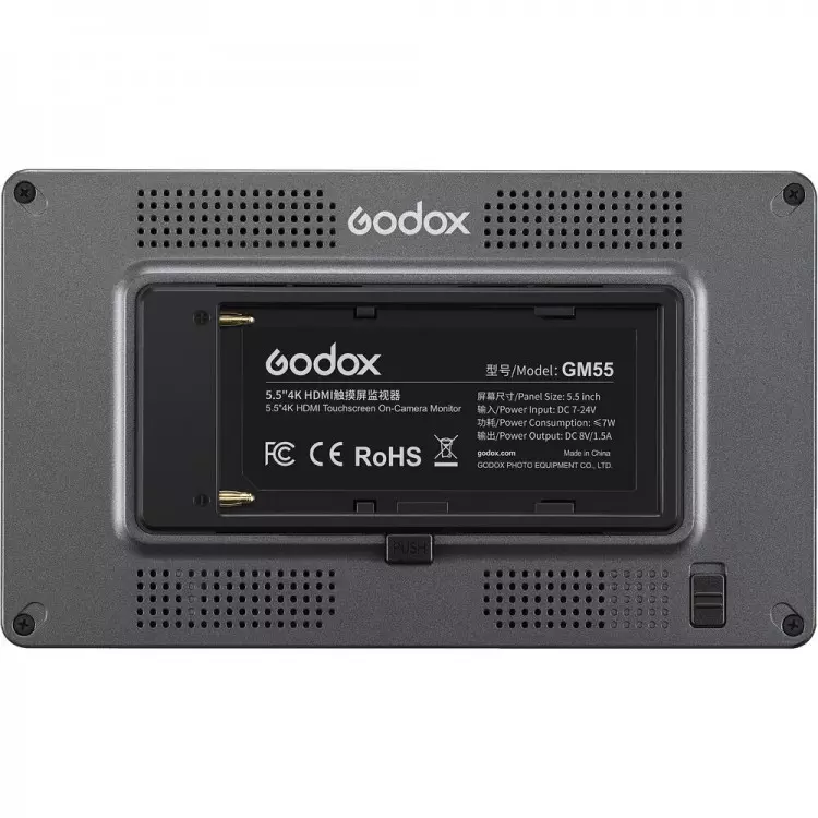 Wykorzystując dodatkową baterię, monitor GM55 może zasilać aparat, znacznie wydłużając czas pracy. Zasilanie monitora może odbywać się z sieci (stałe 7-24V - brak zasilacza w komplecie) lub za pomocą popularnych na rynku akumulatorów typu NP-F970 (7,4V).