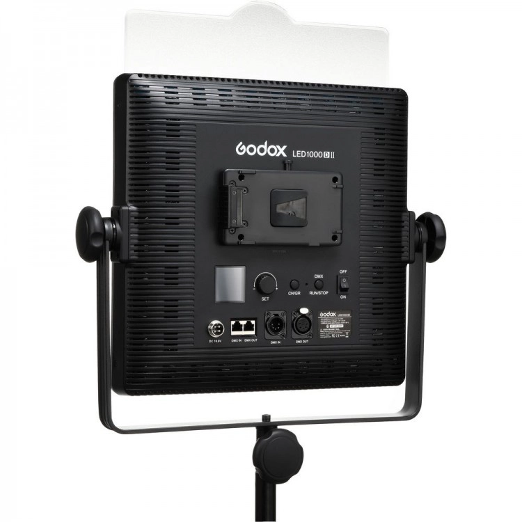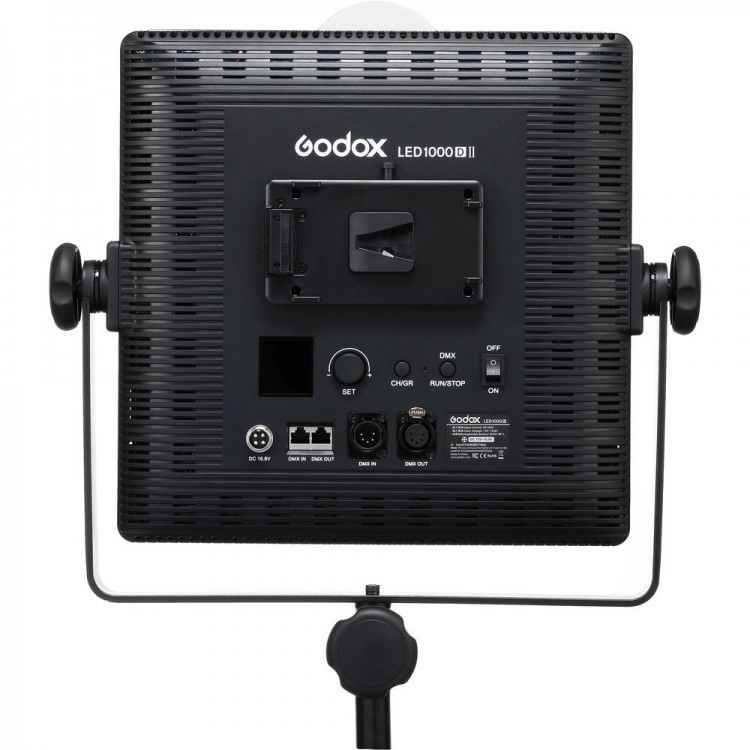 LED1000D II generuje imponującą jasność do 5400 luksów z odległości 1 metra, przy maksymalnym poborze mocy 70W. Standardowe mocowanie statywowe z pokrętłem blokującym zapewnia stabilność i bezpieczeństwo podczas użytkowania. Uchwyt panelu jest kompatybilny z większością statywów oświetleniowych, oferując dodatkowe pokrętło dokręcania dla pewnego dopasowania.