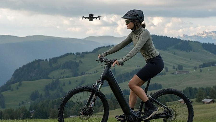 DJI Mini 5 Pro pozwala w pełni skupić się na twórczej pracy, dbając o to, aby obiekt zawsze pozostał w centrum kadru. Ulepszony tryb ActiveTrack 360° zapewnia większą szybkość, zwrotność i bezpieczeństwo podczas śledzenia. Na otwartej przestrzeni dron może osiągać prędkość do 15 m/s, co gwarantuje krótszy czas reakcji i płynniejsze ujęcia. W bardziej wymagającym otoczeniu przełącza się na śledzenie od tyłu, stabilnie utrzymując wybrany cel w kadrze. System automatycznie rozpoznaje również scenariusze sportowe, wybierając pomiędzy trybem Standard a Cycling. W pierwszym przypadku DJI Mini 5 Pro zachowuje stałą wysokość i odległość, a w trybie Cycling błyskawicznie reaguje na dynamiczne zmiany prędkości i kierunku.
