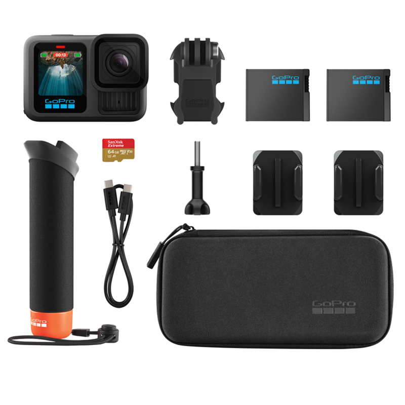 | Dołączone akcesoria | W skład całego zestawu wchodzi: Kamera GoPro HERO 13 Black, The Handler (uchwyt nietonący), 2x akumulator Enduro, 2x mocowanie samoprzylepne do powierzchni zakrzywionych, klamra mocująca, karta SD 64 GB, kabel USB, etui |