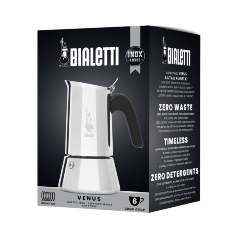 Kawiarka Bialetti Venus 6tz to powiększona wersja kultowej stalowej mokki, idealna do przygotowania 6 filiżanek (300 ml) intensywnego, włoskiego espresso, łącząca nowoczesny design z niezawodną trwałością stali nierdzewnej. Ta oryginalna kawiarka Bialetti Venus jest w pełni kompatybilna z indukcją, kuchenkami gazowymi i elektrycznymi, gwarantując perfekcyjnie zaparzoną, aromatyczną kawę każdego dnia.