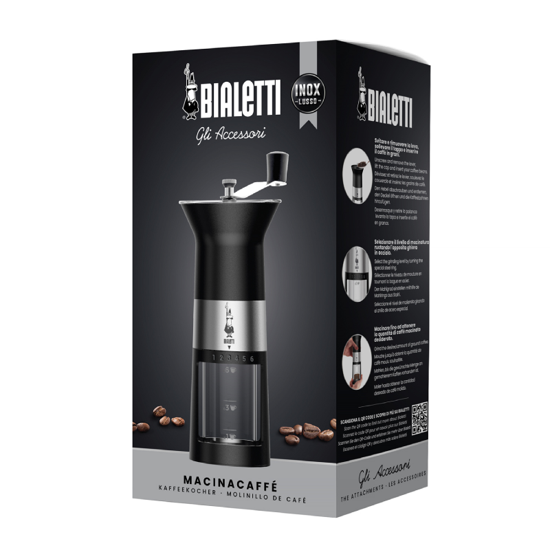 Młynek ręczny Bialetti Pro to stylowe akcesorium ze stali nierdzewnej wyposażone w stożkowe żarna, oferujące 6 precyzyjnych ustawień mielenia, od drobnego espresso i kawiarki, aż po grube mielenie do French Pressa, co gwarantuje wydobycie pełni aromatu z każdego ziarna. Ten funkcjonalny młynek z czytelną skalą pomiarową (na 1tz, 3tz, 6tz) i pojemnością 80 ml łączy kultowy design Bialetti z wysoką jakością wykonania, stanowiąc idealne rozwiązanie dla miłośników świeżo mielonej kawy w domu i w podróży.