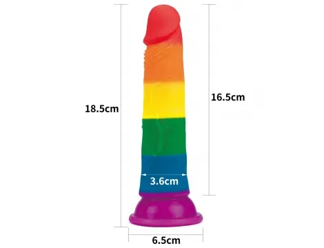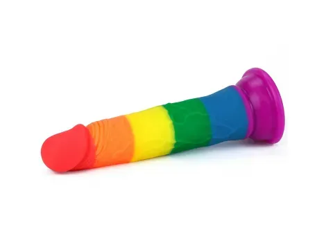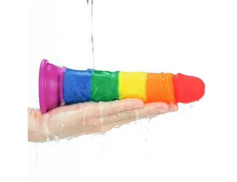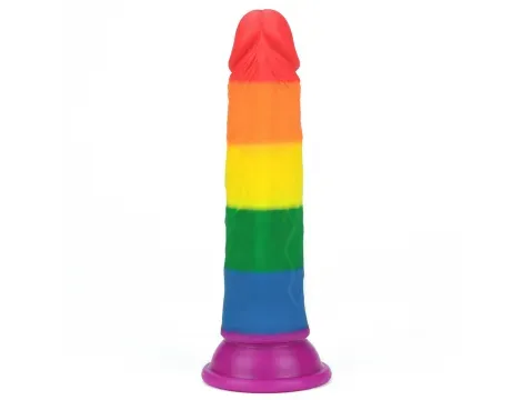Tęczowe dildo z przyssawką wykonane z elastycznego, bezpiecznego silikonu, z realistyczną strukturą i anatomiczną główką, dodające koloru i zabawy do intymnych chwil.