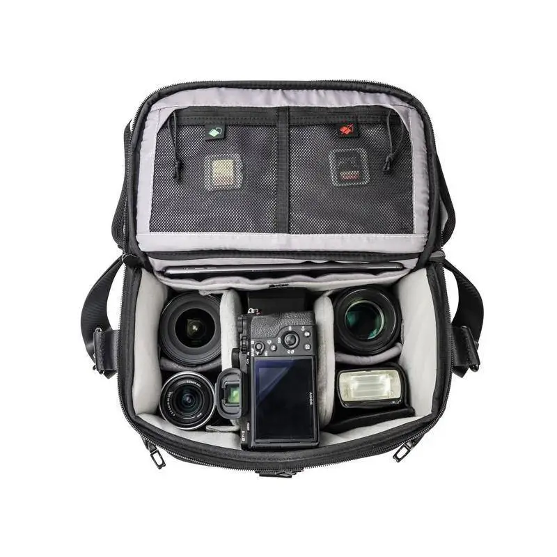 Kompaktowa torba na ramię VEO SELECT 28S została zaprojektowana, aby ważyła jak najmniej. Można ją nosić na dwa sposoby - na ramieniu lub w poprzek klatki piersiowej. Bez względu na zmieniające się warunki atmosferyczne, w których się znajdziesz, mając VEO SELECT, będziesz cieszyć się wszechstronnością, zdolnościami adaptacyjnymi, ochroną i bezpieczeństwem swojego sprzętu. VEO SELECT 28S jest wyposażona w obszerne modułowe przegrody, które zabezpieczają 1-2 profesjonalne lustrzanki cyfrowe z dołączonymi obiektywami, 2-4 obiektywy (do 70-200 f2.8), lampę błyskową, niezbędne akcesoria, a nawet tablet 9,7 cala . Strategicznie rozmieszczone kieszenie wewnętrzne i zewnętrzne pomagają uporządkować inne niezbędne rzeczy — karty pamięci, kable, baterię, ładowarkę i inne — możesz je przechowywać w przegrodzie zapinanej na zamek, albo pod ręką we wsuwanej kieszeni. Pełnowymiarowa kieszeń zapinana na zamek z tyłu wraz z małą „tajną” kieszenią pod przednią klapą zapewniają bezpieczne przechowywanie osobistych rzeczy, takich jak paszport, portfel i smartfon.