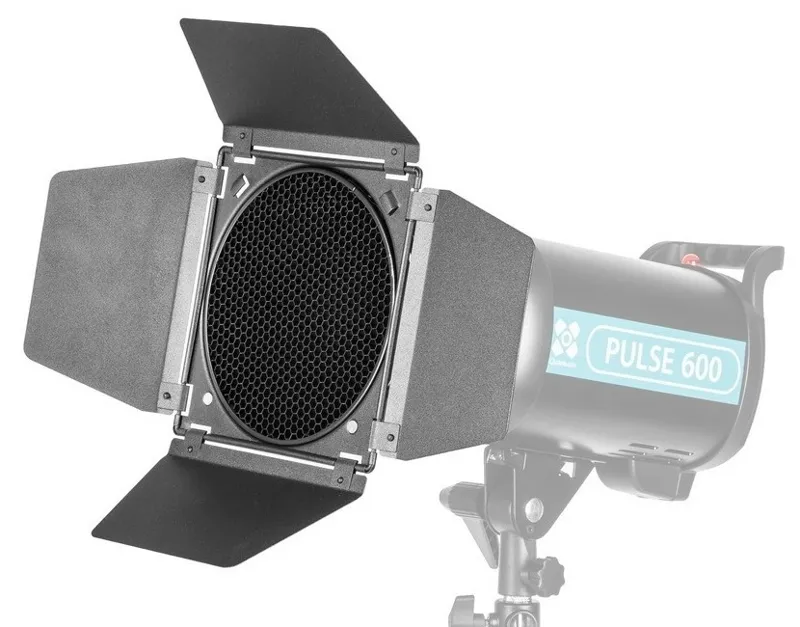 Wysokiej jakości, wykonane z metalu wrota Quadralite do studyjnych lamp błyskowych. Poprzez regulację ustawienia skrzydeł, wrota w kontrolowany sposób ograniczają rozproszenie światła. W zestawie są również 4 kolorowe filtry a także plaster miodu. Wrota są mocowane bezpośrednio na standardowej czaszy 18 cm.