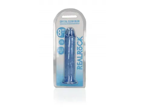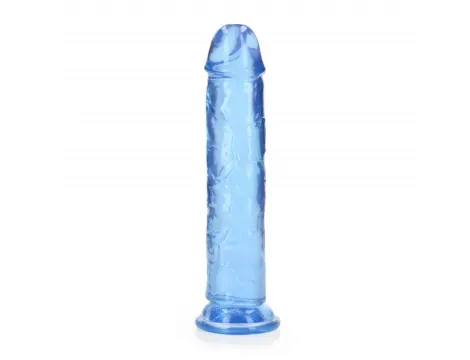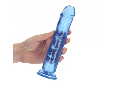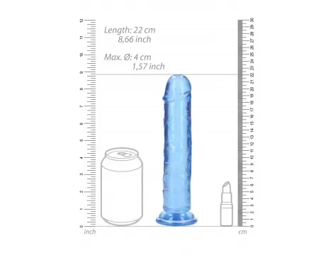 Żelowe dildo o długości 22 cm w kolorze niebieskim, wykonane z miękkiego, elastycznego tworzywa z wyraźnym żylkowaniem i realistyczną główką.